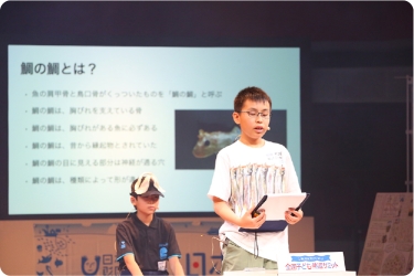 魚の「鯛の鯛」(胸びれを支える骨)に魅了された佐々木蒼大さん(神奈川県)は、さまざまな魚から鯛の鯛を採取し、図鑑を作成。魚の種類によって鯛の鯛の形・大きさにも違いがあることを学びました。石野立翔さん(千葉県)は、サメの研究から学んだことを発表。「サメの世界はわからないことだらけですが、その謎をみんなと討論する時間が大好きです」と語り、サメを傷つける海洋ゴミについても問題提起をしました。