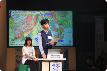 北海道から来た水上咲季さんは、自ら撮影したオホーツク海の流氷の様子を写真や動画で紹介。海氷の減少によって気温上昇、海洋循環、生態系などに影響を及ぼし、私たち人間にも無関係ではないと警鐘を鳴らしました。地元の姫路海岸を調査した山下遼恭さん(鳥取県)は、同じ海岸の砂浜でも場所によってカニの巣穴の数や大きさに違いがあること、大量の生活ごみが流れ着いていたことなどを報告。「10年後も20年後も、カニも僕たちも楽しく遊べる砂浜を」と訴えかけました。