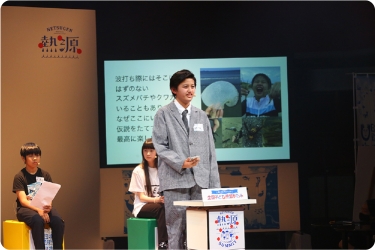 最後に登壇したのは、熱源ジュニアたちの発表を“先輩”として見守った3人のゲストオブザーバー。社会、生物、海洋環境の専門家たちも、子どもたちの熱いプレゼンテーションに胸を打たれている様子でした。 「普段、私は若者の社会参画を呼び掛けていますが、熱源ジュニアの皆さんが友だちや行政を巻き込み、社会を変えていく姿に感動しました。今後も『どうやったら社会がより良くなるのか』を考えて、ぜひ行動に移してほしいと思います」(たかまつななさん/㈱笑下村塾 代表取締役) 「20人いれば20通りの海の見方、活動の方法があると改めて感じた。皆さんが次の時代のリーダーになっていくと思うので、どんどんまわりに熱源を広めていってほしい。“好き”や“ワクワク”の気持ちを大切にして活動を続けてください」(鈴木香里武さん/岸壁幼魚採集家) 「びっくりしたのは、課題を可決しようとする力だけでなく、課題を発見しみんなで解決しようという力を皆さんが持っていること。すごく刺激になるとともに、皆さんの熱が伝わってきて、自分ももっとがんばらなければいけないと思いました」(野牧秀隆さん/JAMSTEC主任研究員)