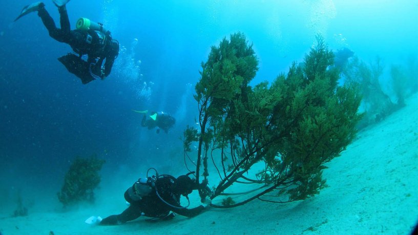 「発端は2000年頃のダイビングバブル。元々漁業の島だった柏島にファンダイビングを導入したのは、実は私なんですが、その後ダイバーが増えすぎたことで地元漁師たちとの確執が生まれました。ちょうどアオリイカが不漁となり、その原因はダイビングではないかと漁業者が訴えたことで一気に対立が激化。こんな揉め事があっては悲願の“島まるごと”が実現せんと思い、まずはダイバーと漁業者との共存の道を探ろうと、自分はダイビングガイドをすっぱり止めて中立の立場で動き始めました。両者が一緒に頑張ってイカを増やす方法はないか。イカ不漁の真の原因は磯焼け(藻場の減少)ではないのか。調査を進めつつあれこれ模索して考えついたのが、イカが産卵する藻場の代わりに森の木を海に設置する方法です。石を付けて適当に放り込むのではなく、水深20mの産卵に最も適した場所に、ダイバーが潜って的確に固定することに意味があります」