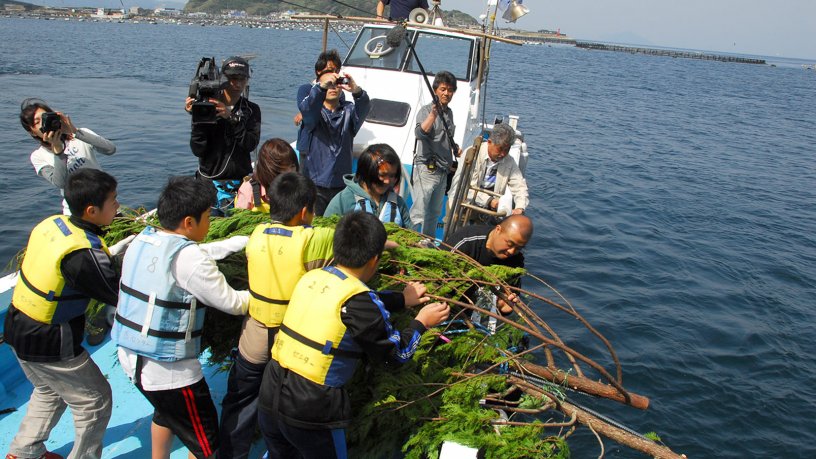 地域の漁業者、ダイバー、森林組合など林業者が一緒に取り組む、海の中の森づくり。3年目には地元小学校の環境学習にも取り入れられ、山での間伐から産卵床づくり、海への投入まで可能な範囲で子どもたちも関わるように。
