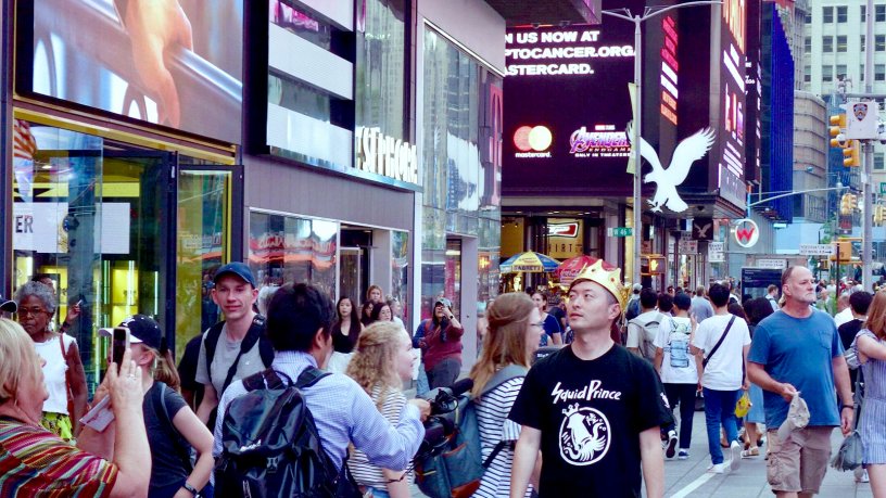 (↑)ニューヨークでいかそうめん試食販売を行ったことも。王冠をかぶったイカ王子がマンハッタンの街をゆく…